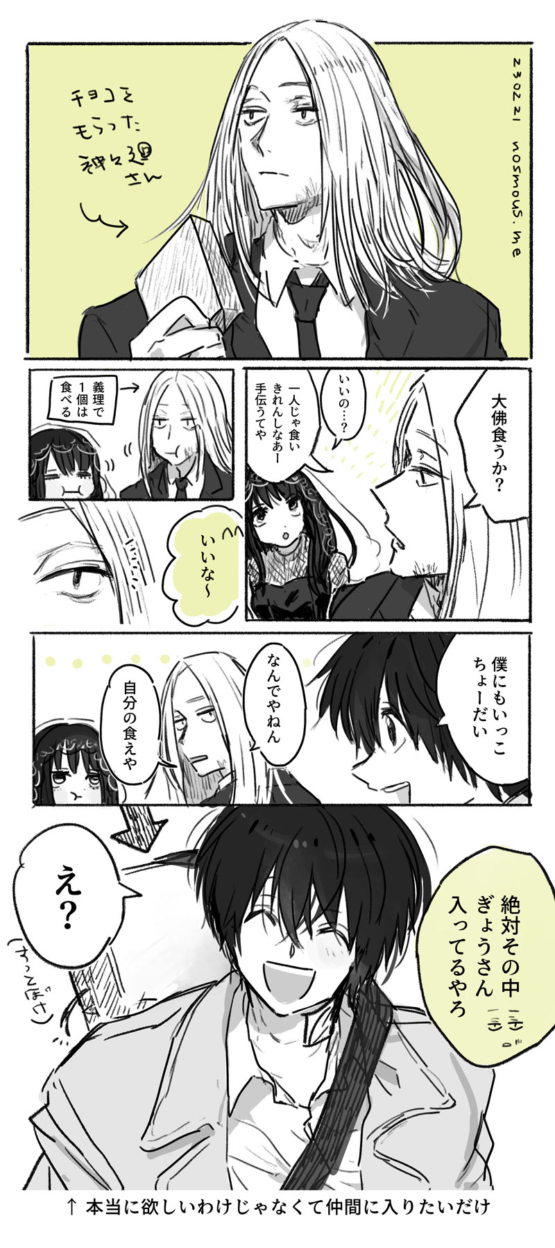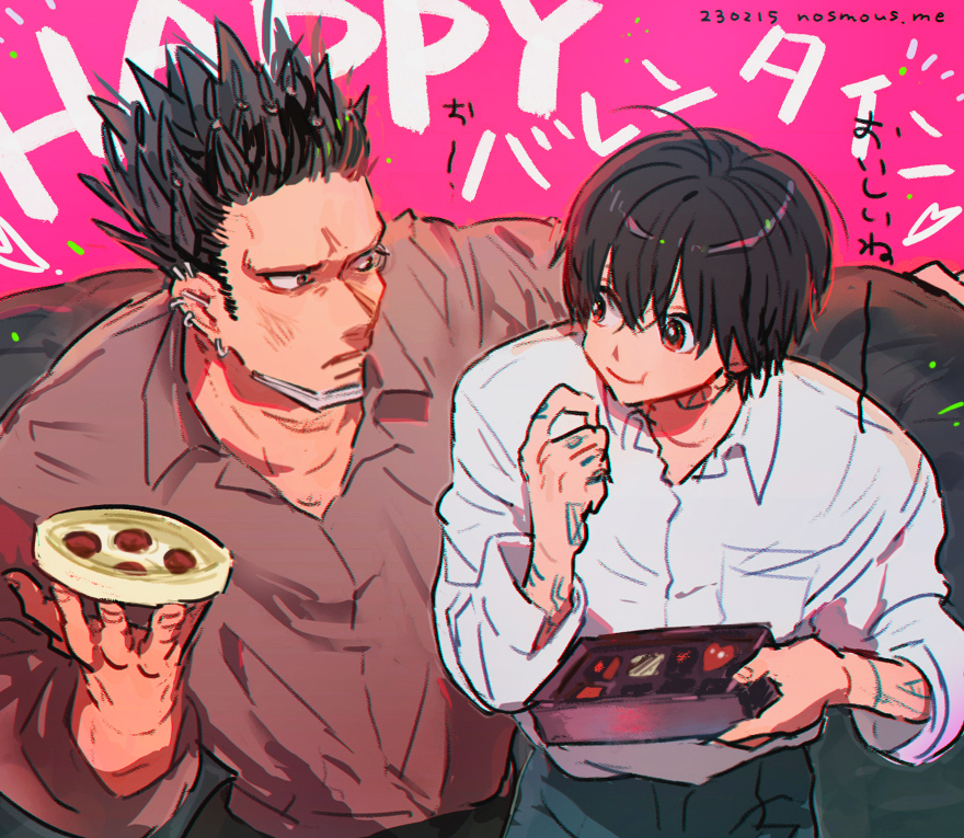 お互いがあげたチョコを食べている…と見せかけて、殺連の女性社員たちからもらったチョコを「これおいしいよ~~」って交換しながら一緒に食べてるヒョウナグ。
